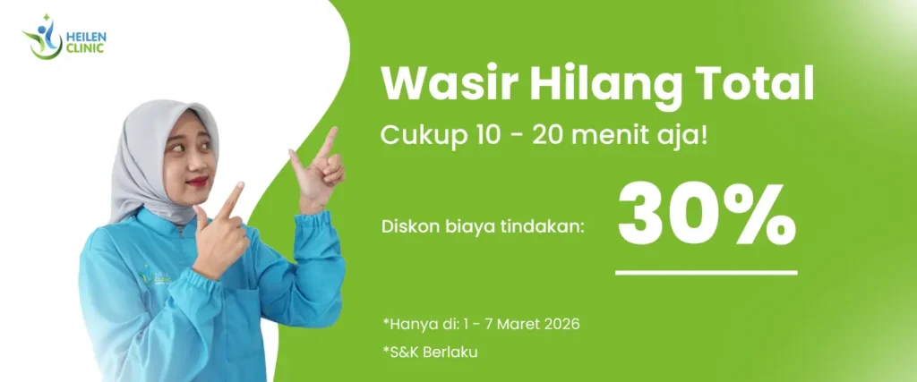 Heilen Clinic adalah klinik spesialis wasir di Semarang yang memiliki fasilitas pengobatan dan perawatan khusus wasir yang aman dan nyaman. Di samping itu, Heilen Clinic memiliki tim dokter yang profesional serta berbagai jenis alat medis yang modern dan canggih. Heilen Clinic berfokus pada pengobatan berbagai jenis wasir TANPA OPERASI, sehingga tidak perlu rawat inap dan bisa langsung beraktivitas.